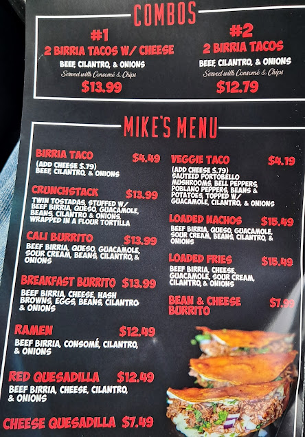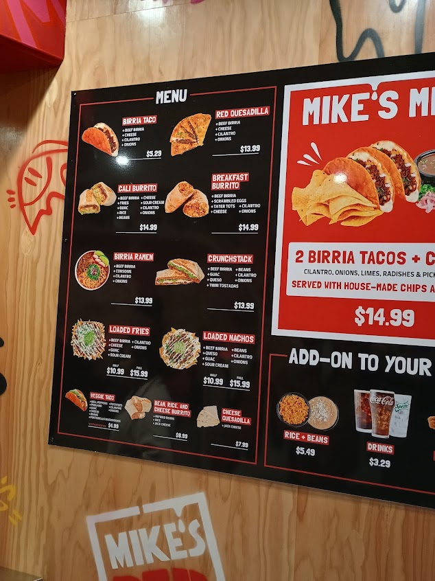 Welcome to Mike’s Red Tacos Restaurant, your go-to destination for bold, authentic Mexican flavors in San Diego. Known for our legendary tacos and slow-cooked birria, we take pride in serving high-quality food made with traditional recipes and fresh ingredients. Whether you’re stopping by for a quick bite or enjoying a full meal, the Mike’s Red Tacos Restaurant menu offers a mouthwatering selection of tacos and Mexican favorites that keep locals and visitors coming back for more. Experience real flavor, fast service, and a true taste of Mexico every time you visit.